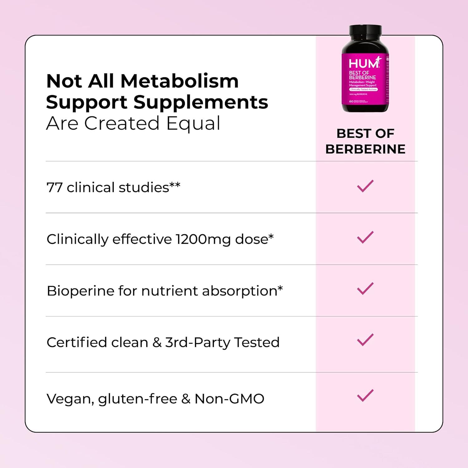HUM Best of Berberine Supplement 1200mg, Pure Potency for Metabolic Wellness, Gut Health, Pure Berberine Supplements Enhanced with BioPerine for Maximum Absorption, 60 Capsules