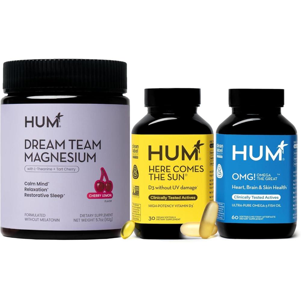 HUM Daily Wellness Essentials Bundle – Dream Team Magnesium + OMG! Omega The Great + Here Comes The Sun Vitamin D3
