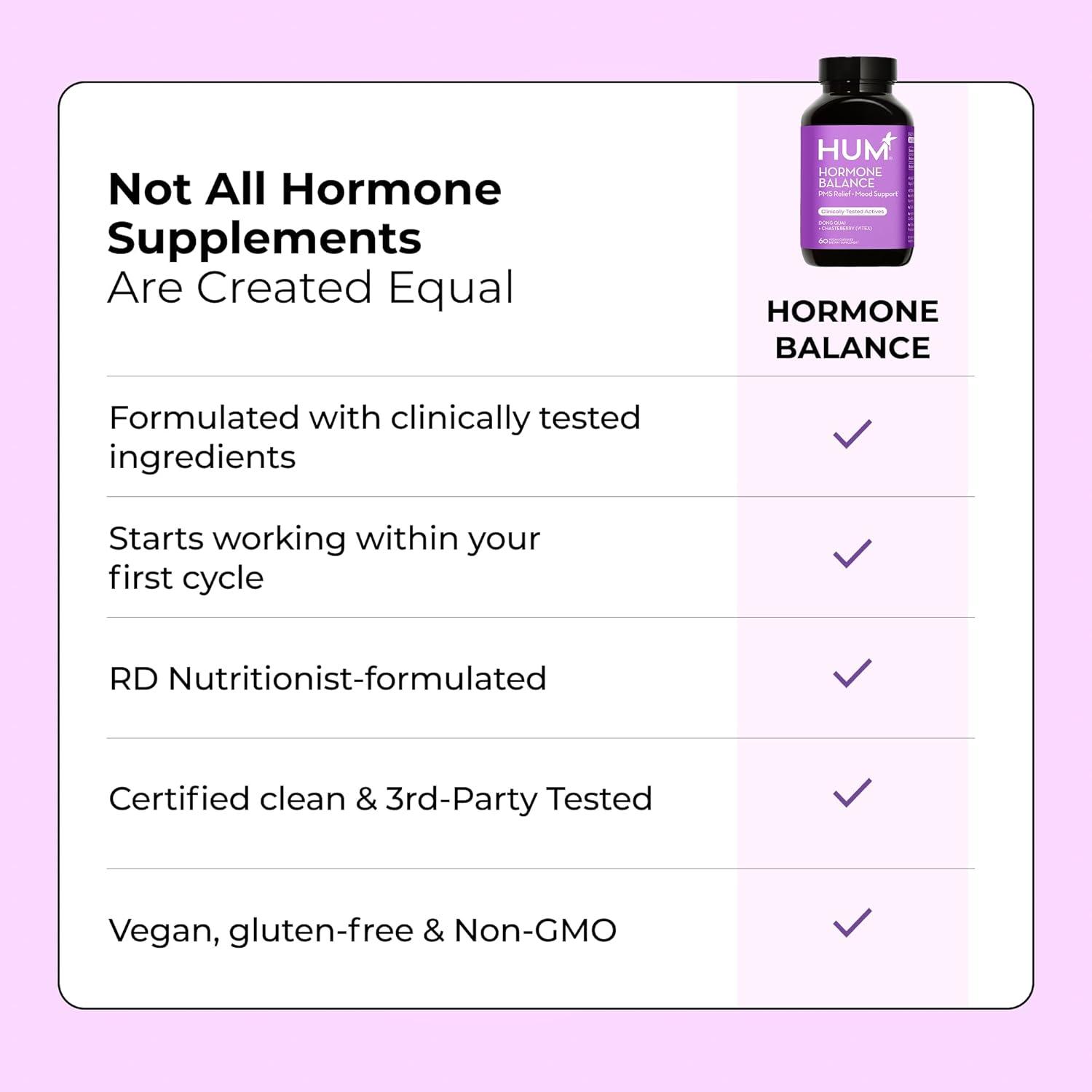 CLEAN AND CLINICALLY STUDIED: HUM products are Clean Label Project Certified, non-GMO, and rigorously tested to meet the highest standards of safety and quality. Free from artificial flavors, sweeteners, and colors, you can trust the purity and effectiveness of Hormone Balance capsules.